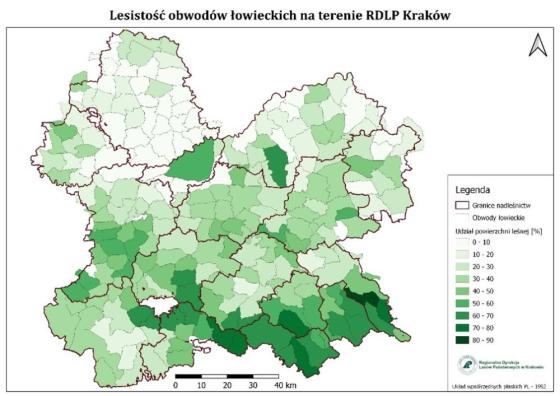 Obwody łowieckie wydzierżawiane są kołom łowieckim lub stanowią Ośrodki Hodowli Zwierzyny (OHZ) i zarządzane są przez Lasy Państwowe, Polski Związek Łowiecki lub instytucje naukowe. Ze względu na udział powierzchniowy lasu obwody łowieckie dzielą się na leśne (ponad 40 % lasu) i polne ( ponad 40 % pól). Aktualnie w granicach Regionalnej Dyrekcji Lasów Państwowych w Krakowie znajduje się 206 obwodów łowieckich obejmujących łączną powierzchnię 1 309 414 ha.